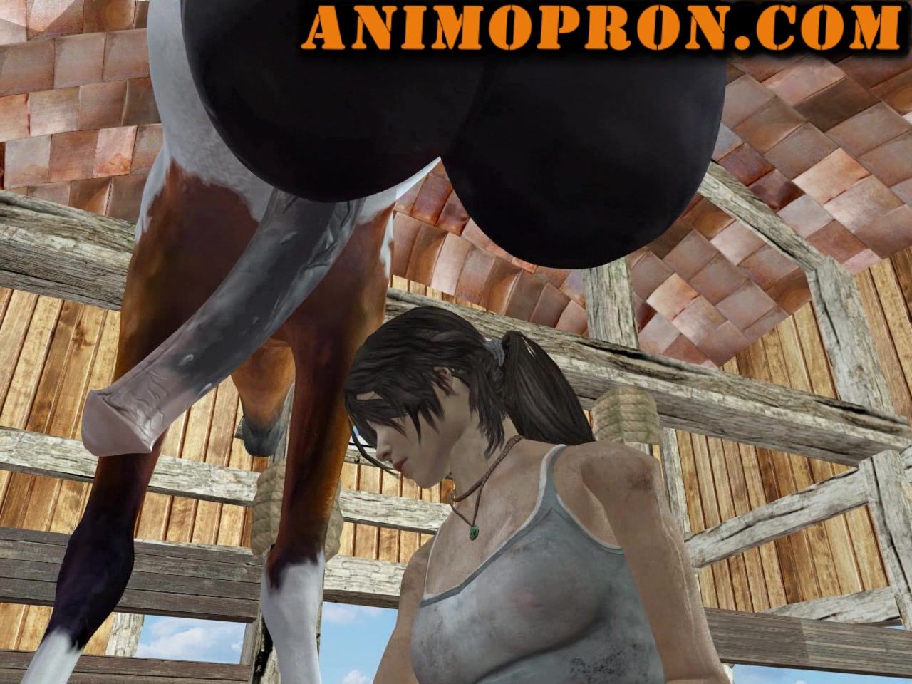 La perra caliente Lara Croft se masturba una polla de caballo y lame bolas grandes