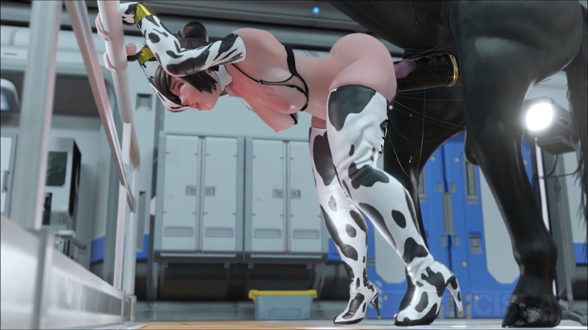 The animated rider Mei loves to ride a horse. But today the rodeo is canceled. The black stud stands up from behind and penetrates the brunette's pussy with his huge penis. The girl moans and feels the cock fucking her hole all the way to her uterus. Dirty sex of a beauty and a horse in the famous cancer position.