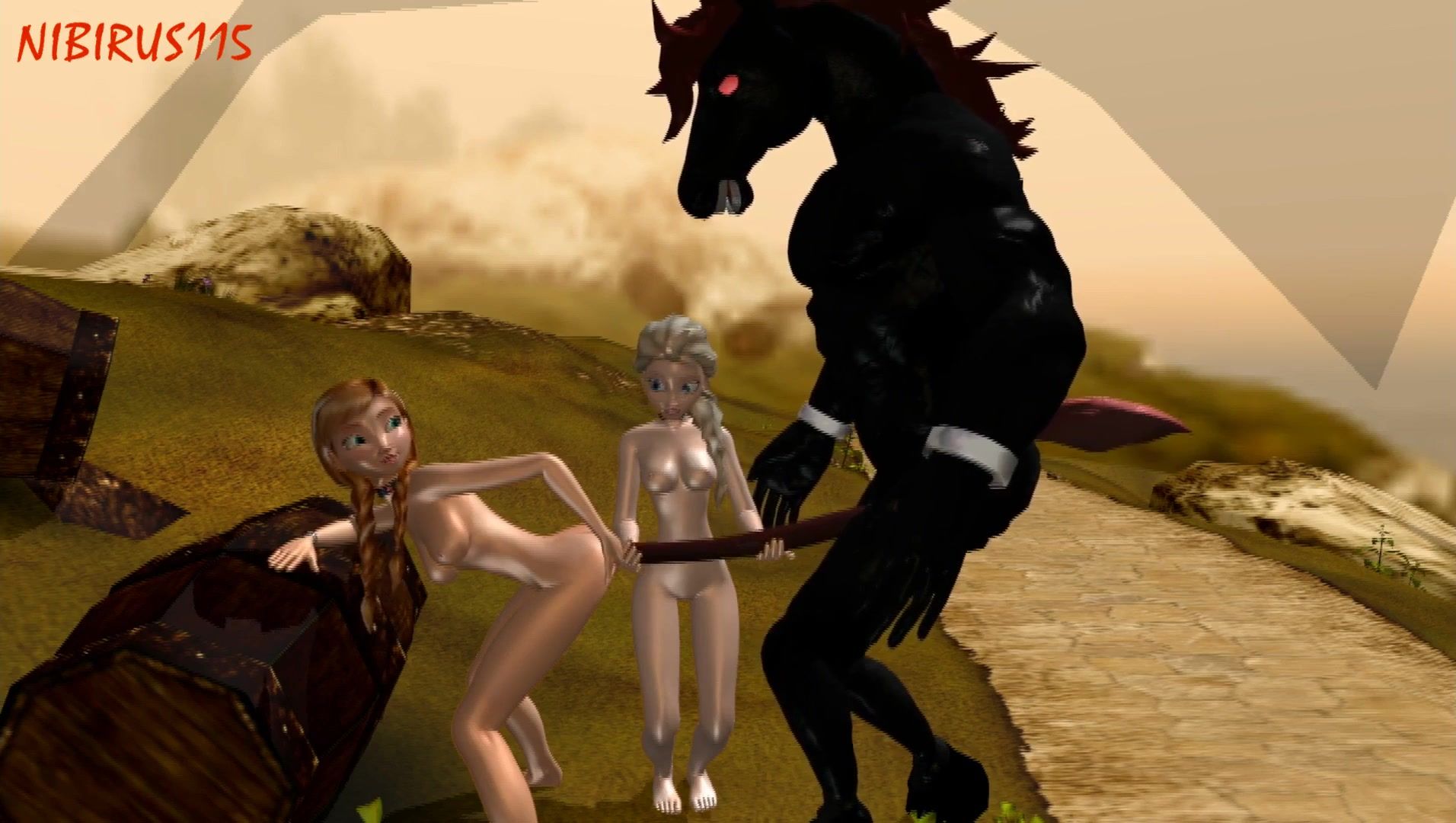 Elsa and Anna impaled on an enormous horse cock