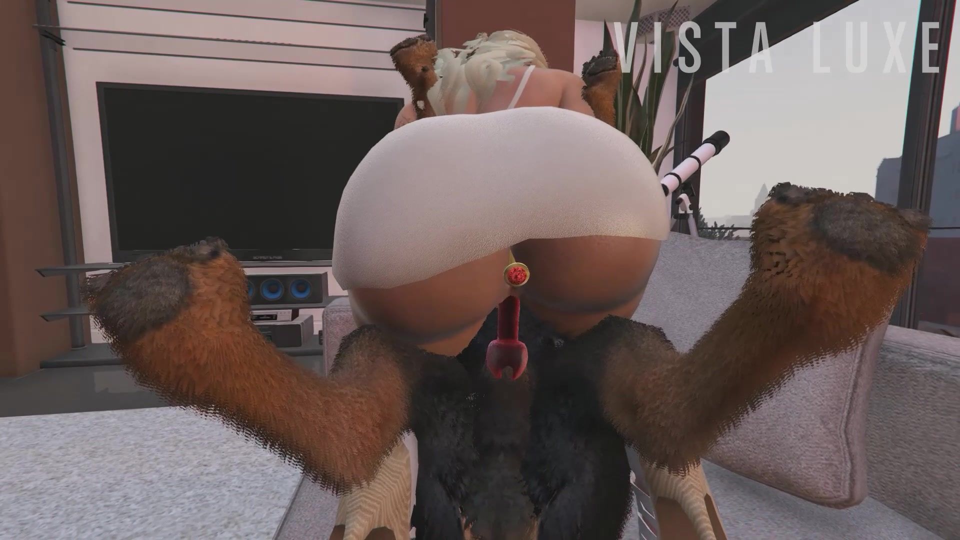 A horny 3D wife with a great ass, not waiting for her husband from work, fucks the dog. Blonde with big tits, wanting sex, took off her panties and sat down with her pussy on the dog's cock. Wife cheats on her husband with a giant dog and fucks on the couch like a dirty whore.