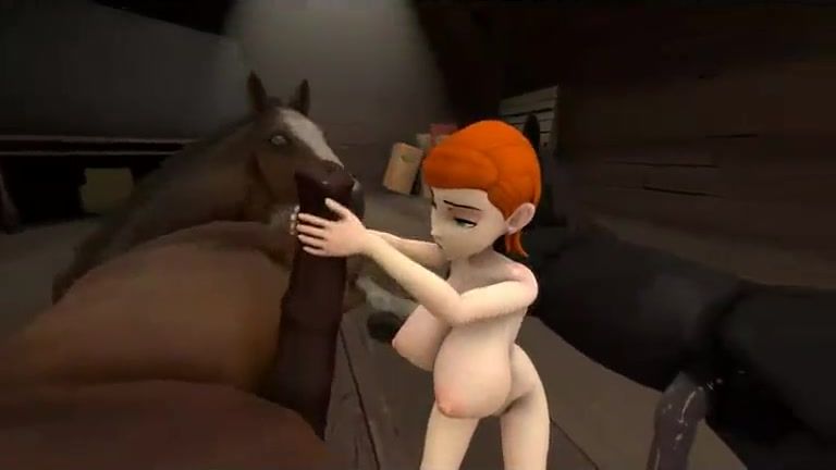 A young redheaded girl with big tits, came to the stables to feed the horses. And when the young girl saw the horses' long cocks, she started touching and sucking them. The anime girl loved it and after undressing, she started fucking the horses in her tight cunt.