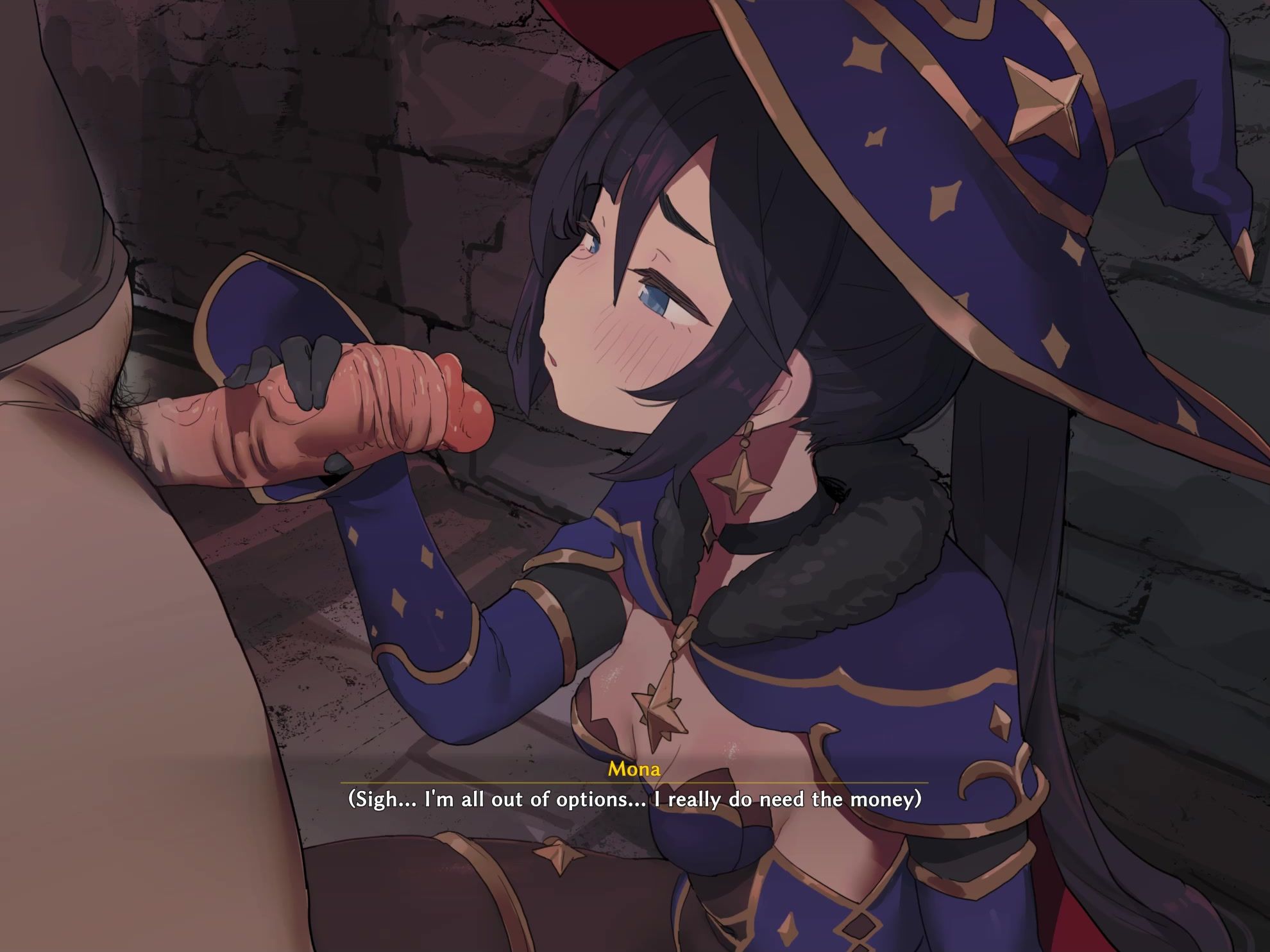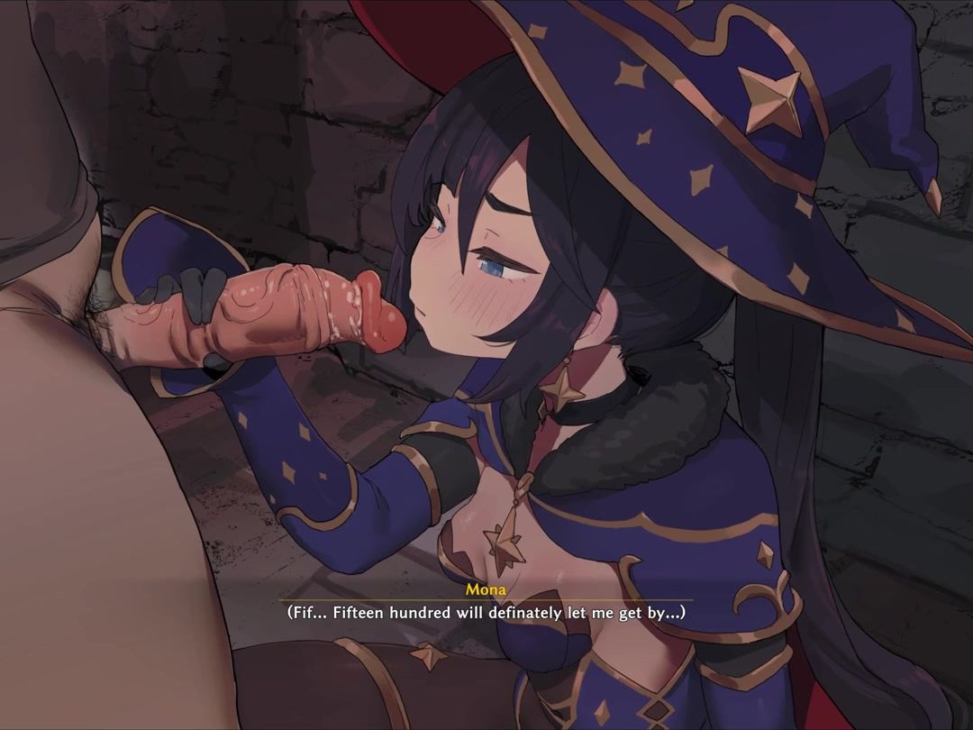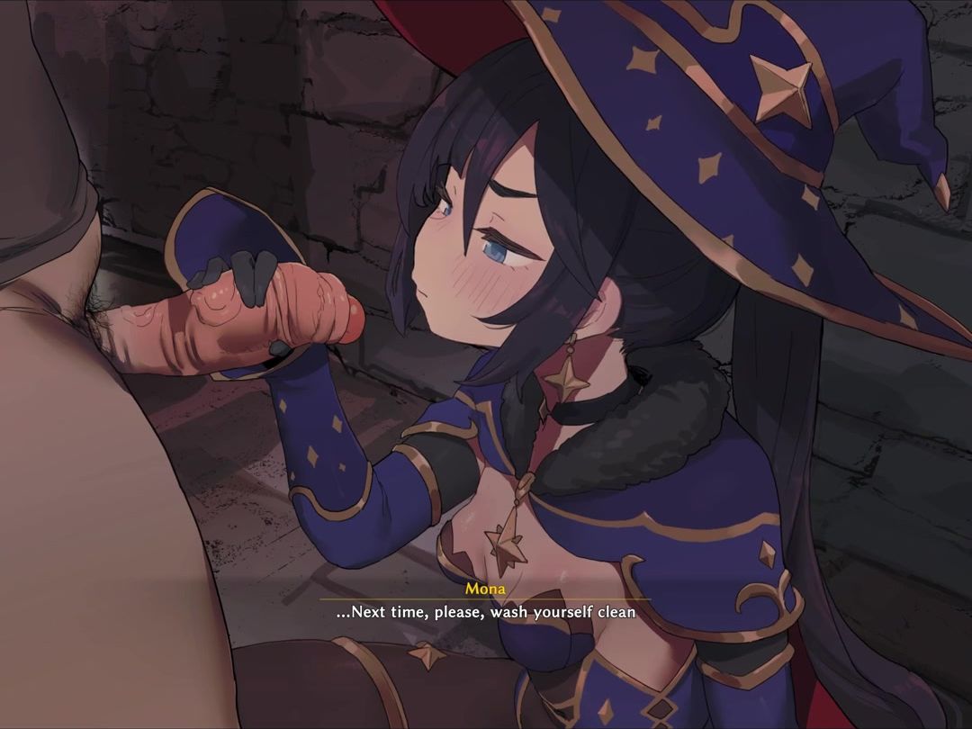 Desperate witch Mona plays with a big cock to cheer herself up. She milks the man and gives him a sensual blowjob. The anime chick licks her pink buttocks, jerks her hot flesh and gets a hard shot of cum in her mouth, which she loves to swallow so much.