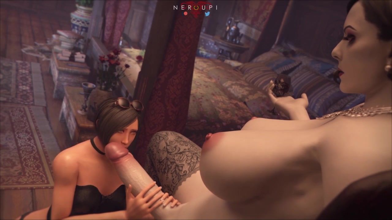 Lady D on her knees blowing Lady Dimitrescu's big dick