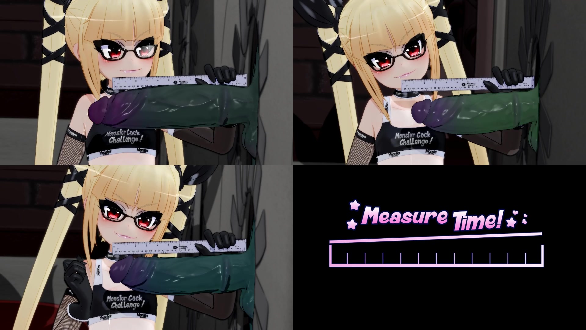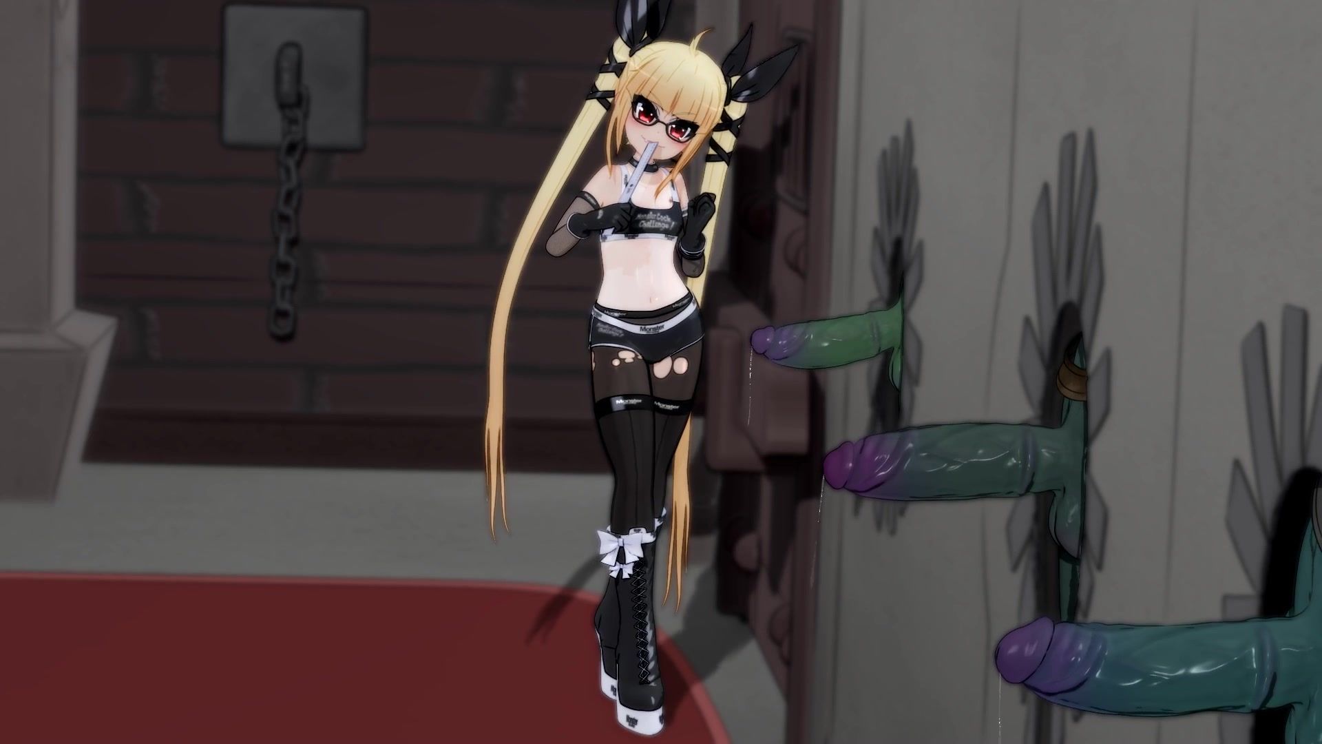 A long-haired cartoon blonde with small tits went down to the basement. In the locked cell sat huge black guys with long dicks, which they stuck out through holes in the wall. The babe measured them with a ruler, picked out the biggest dick and had a good fuck through the glorichol.