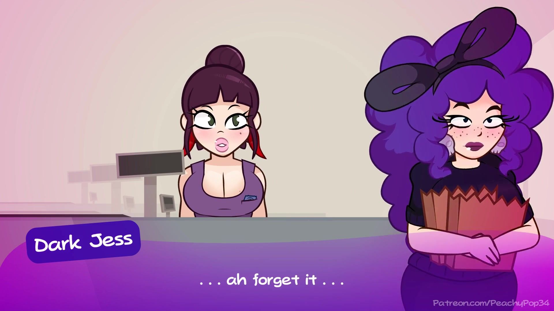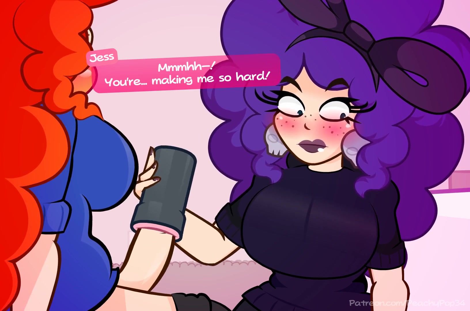 The redheaded girl Jess from the animated porn cartoon met her dark half. Dark Jess aroused her and started jerking off her big futanari cock with her hands. A minute later she was already using the masturbator to give Jess a nice blow job a little later.