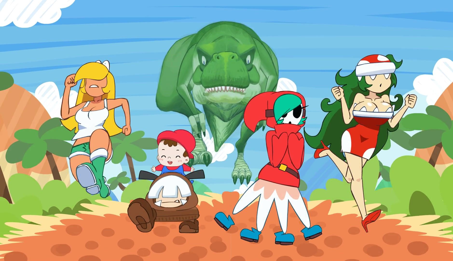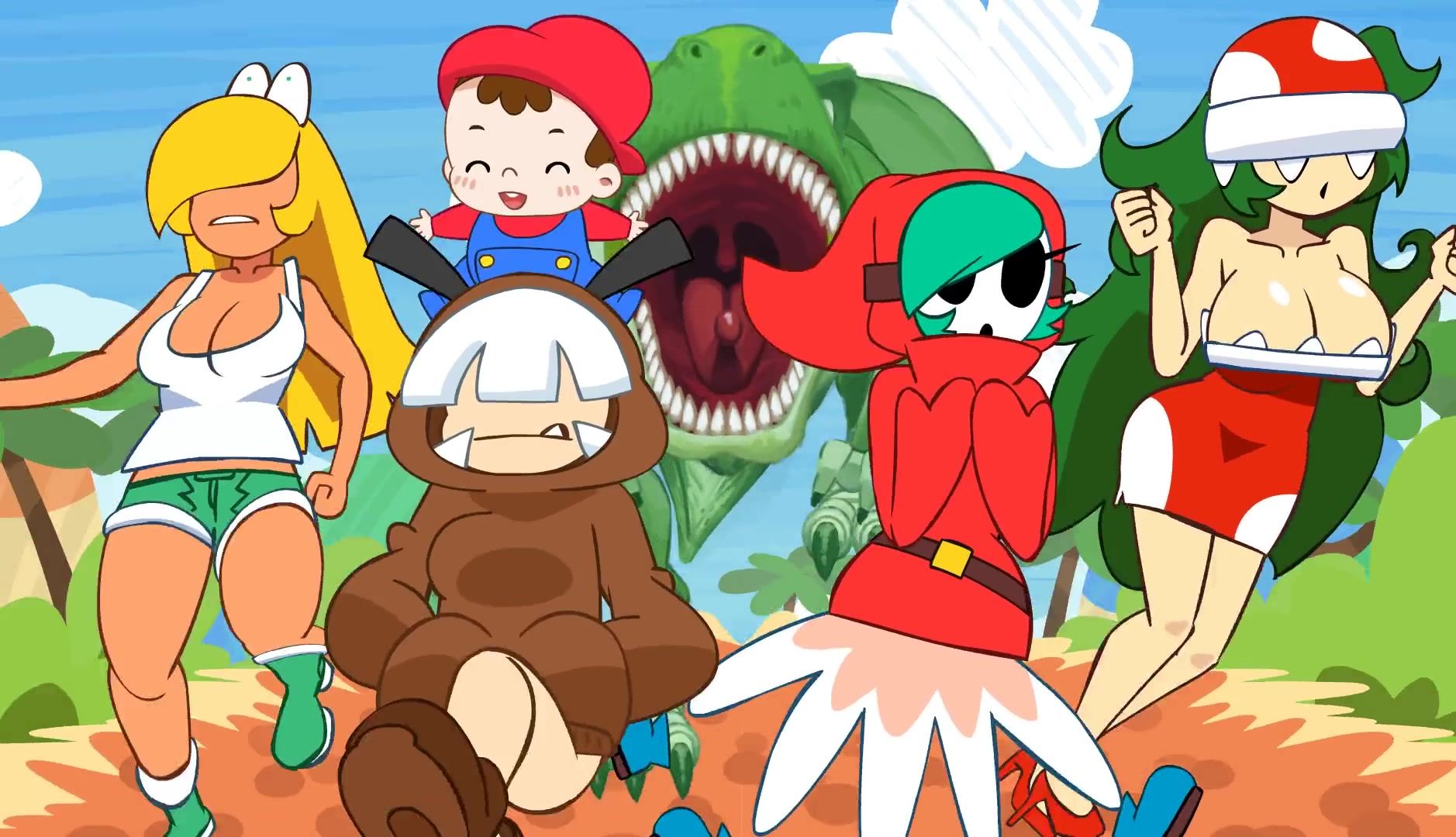 A hilarious cartoon about baby Yoshi and his giant tyrannosaurus will interest and excite anyone. The good friends get to Yoshi's island, and when they meet him, they have to run away from the dinosaur. But the dinosaur is determined to catch up with the chicks and rip their clothes off.
