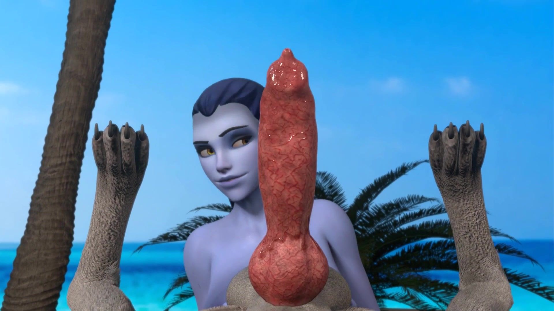The titty girl Widowmaker from Overwatch was relaxing on the beach and saw a dog with a protruding penis. She started stroking it and it got even bigger. When she sucked it, it became huge. Then she got down on top of him and enjoyed anal sex on the beach.