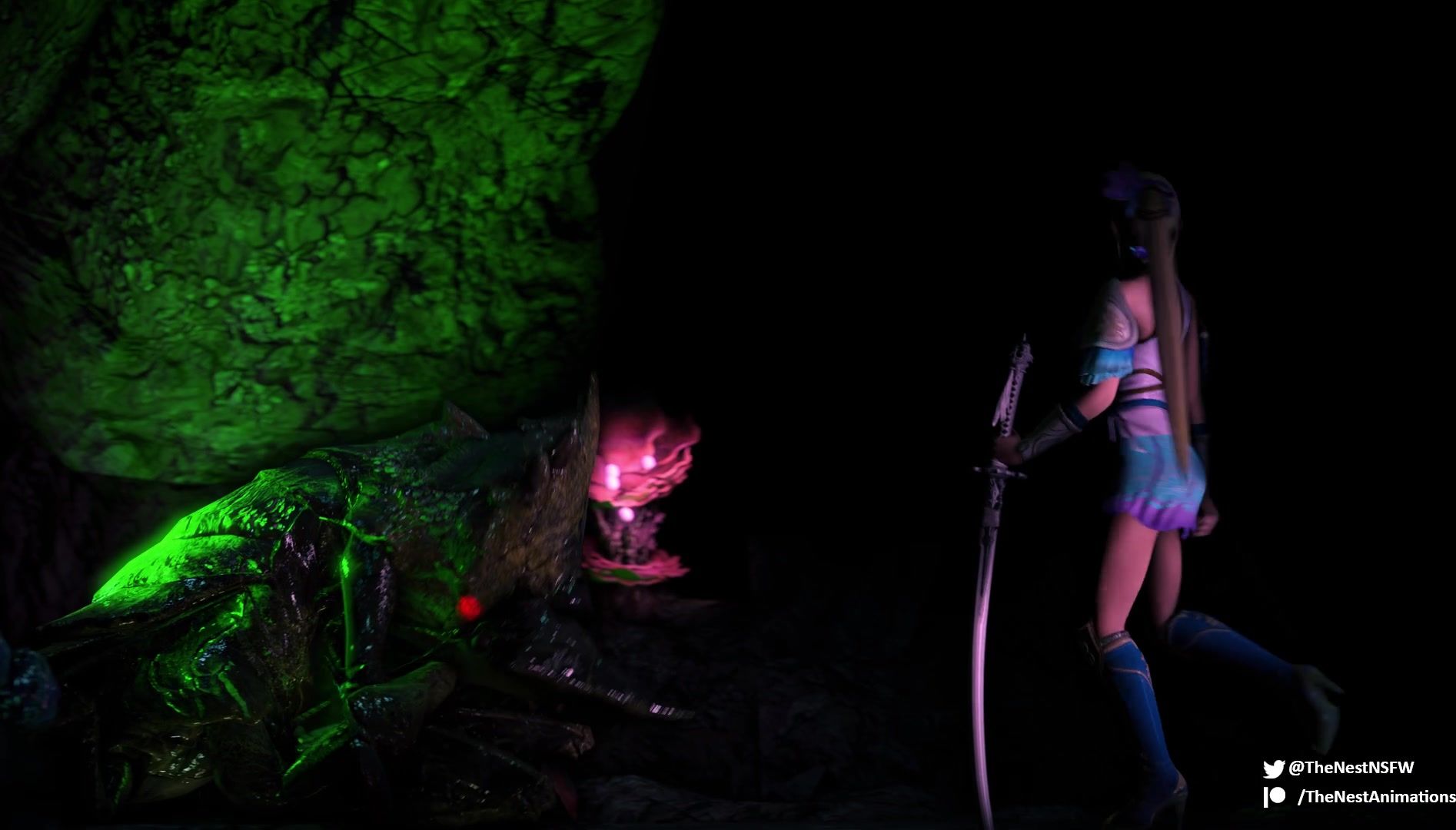 The warlike princess from the 3D porn cartoon entered a cave with scary big insects. They looked like mantises, but really gigantic in size. The girl thought about defeating the bugs with a sharp blade, but they grabbed her, raped her and filled her pussy with cum.