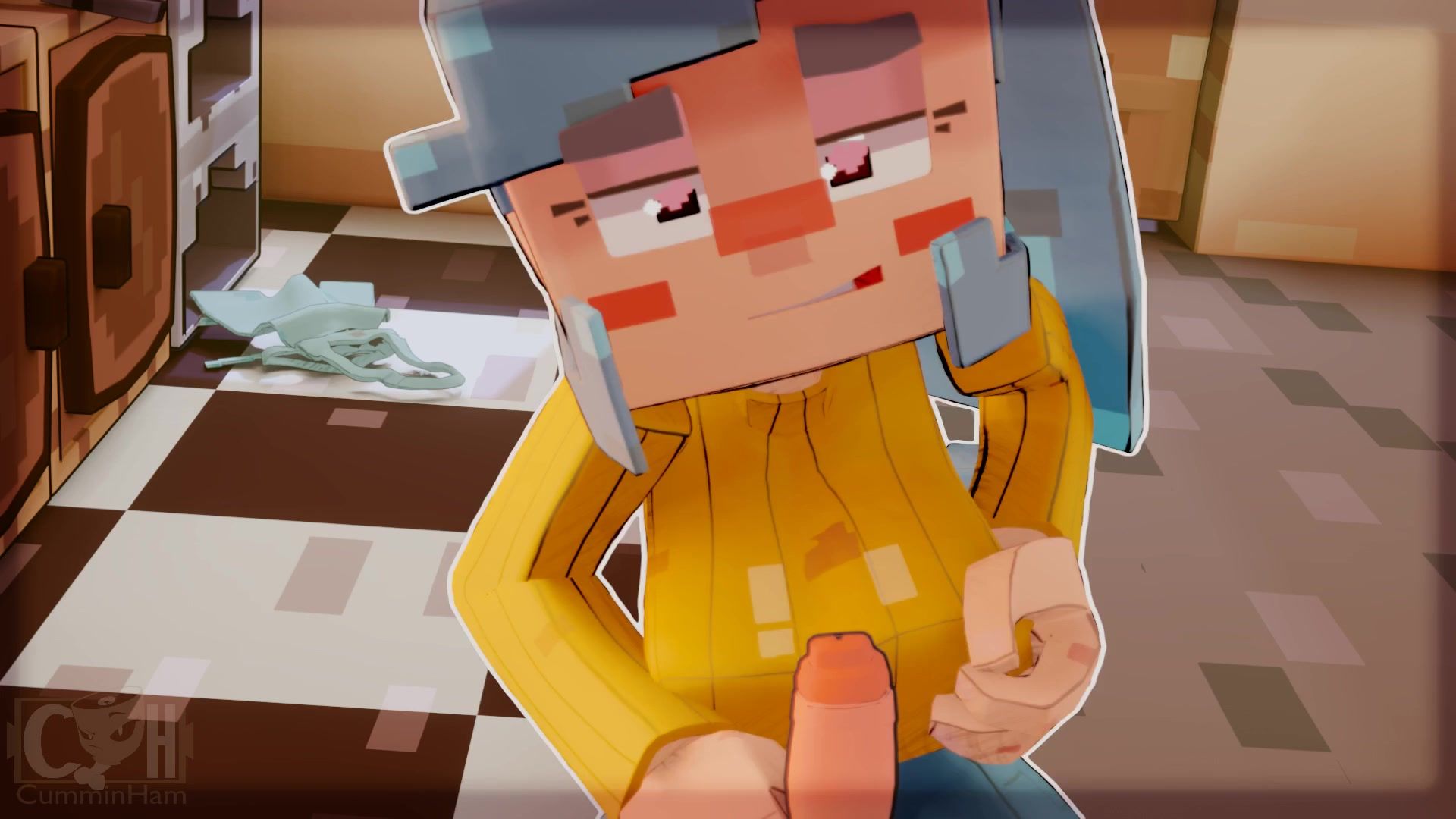 Minecraft housewife wanks in the kitchen