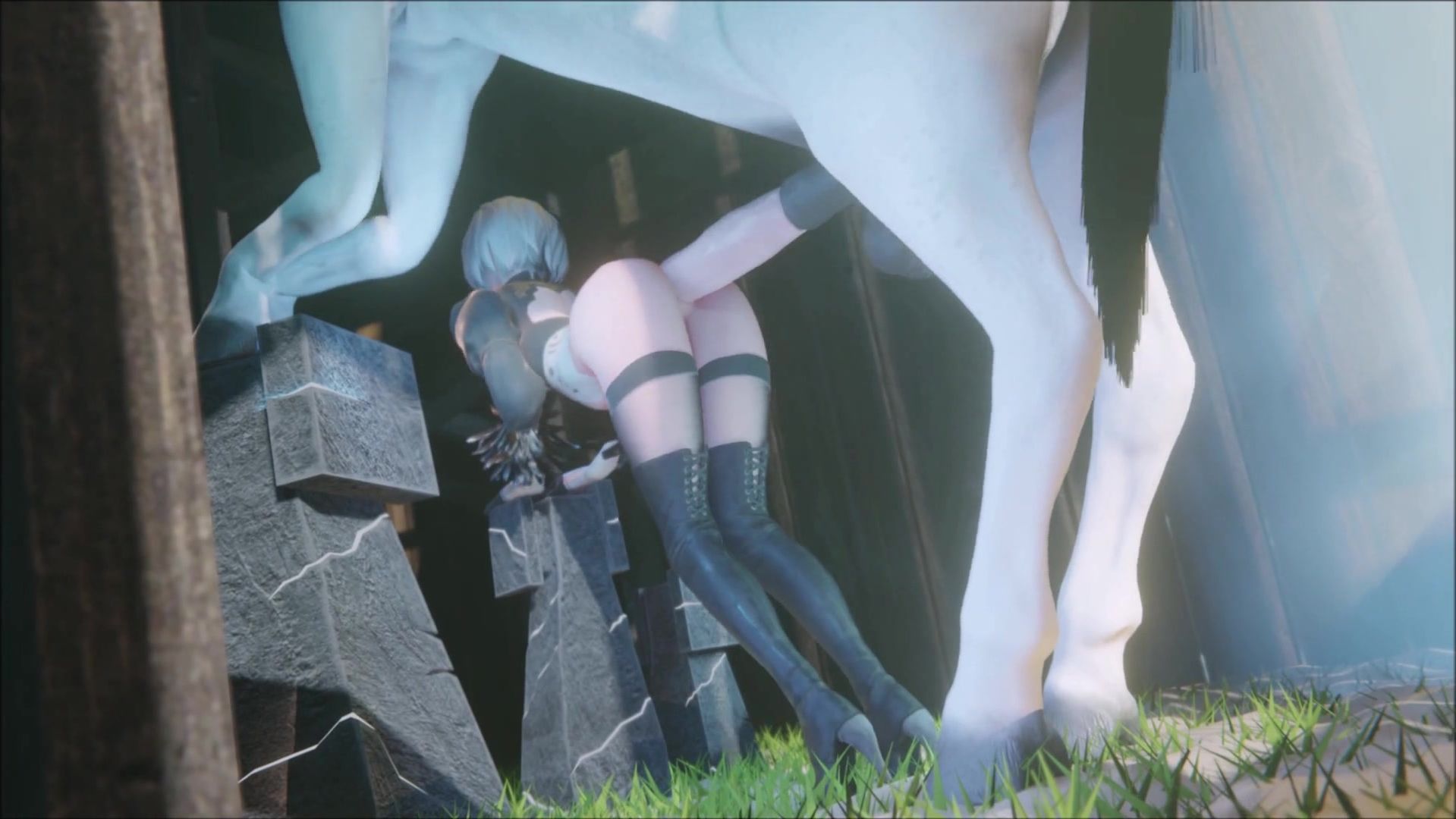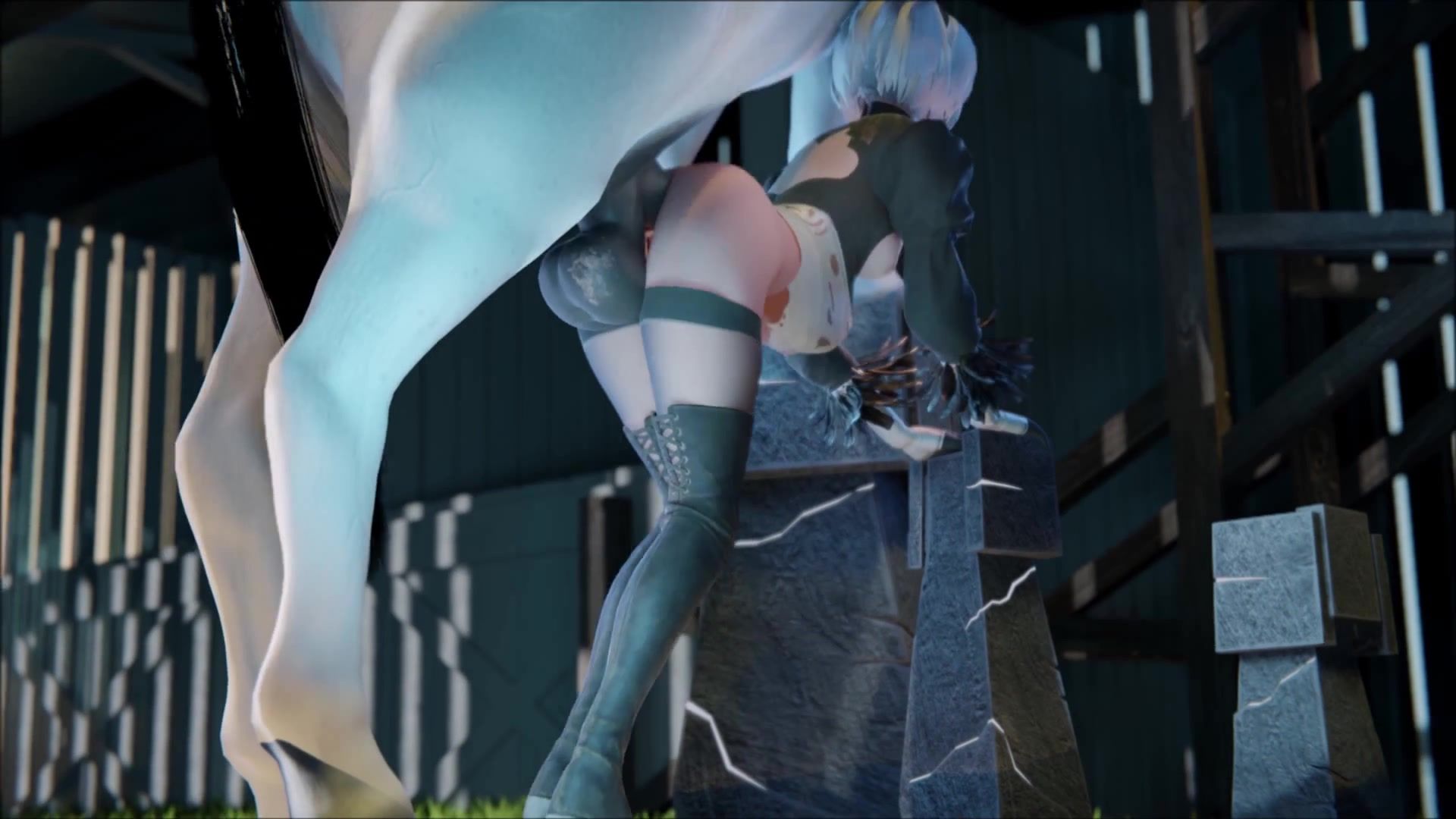2b gets bent over and fucked doggystyle by horse