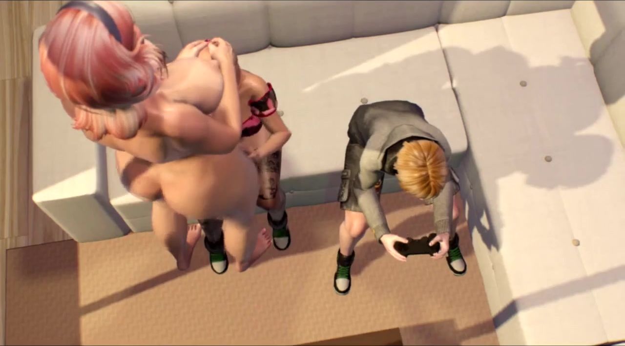 Futa stepmother fucks beautiful stepdaughter in pussy while her son plays on console
