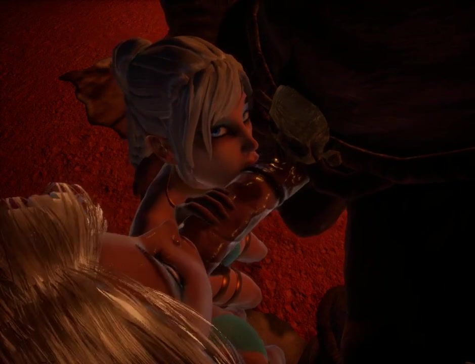Two girls suck a long dick of a bull in a dungeon
