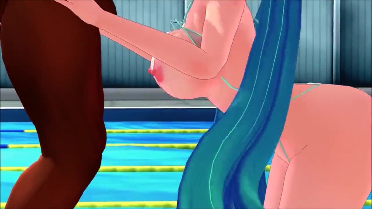 Young anime girl sucking muscled guys by the pool