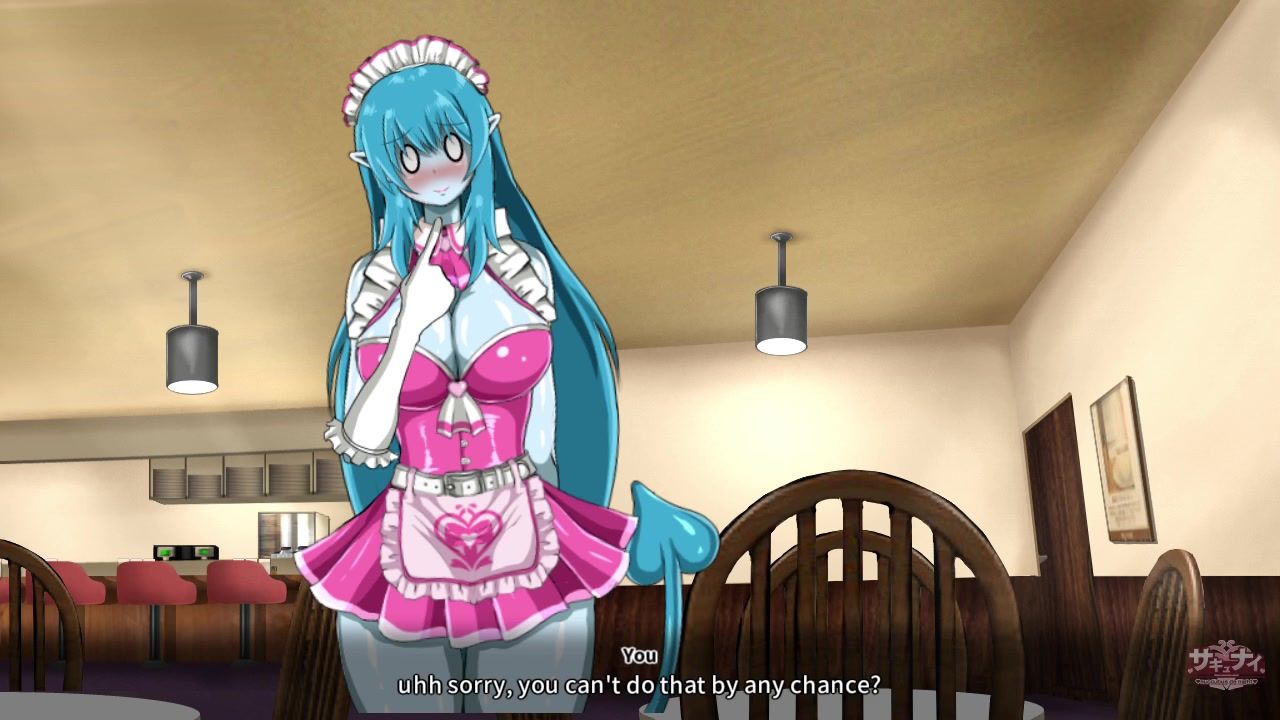 Cartoon waitress in a skirt put on a dick in a cafe