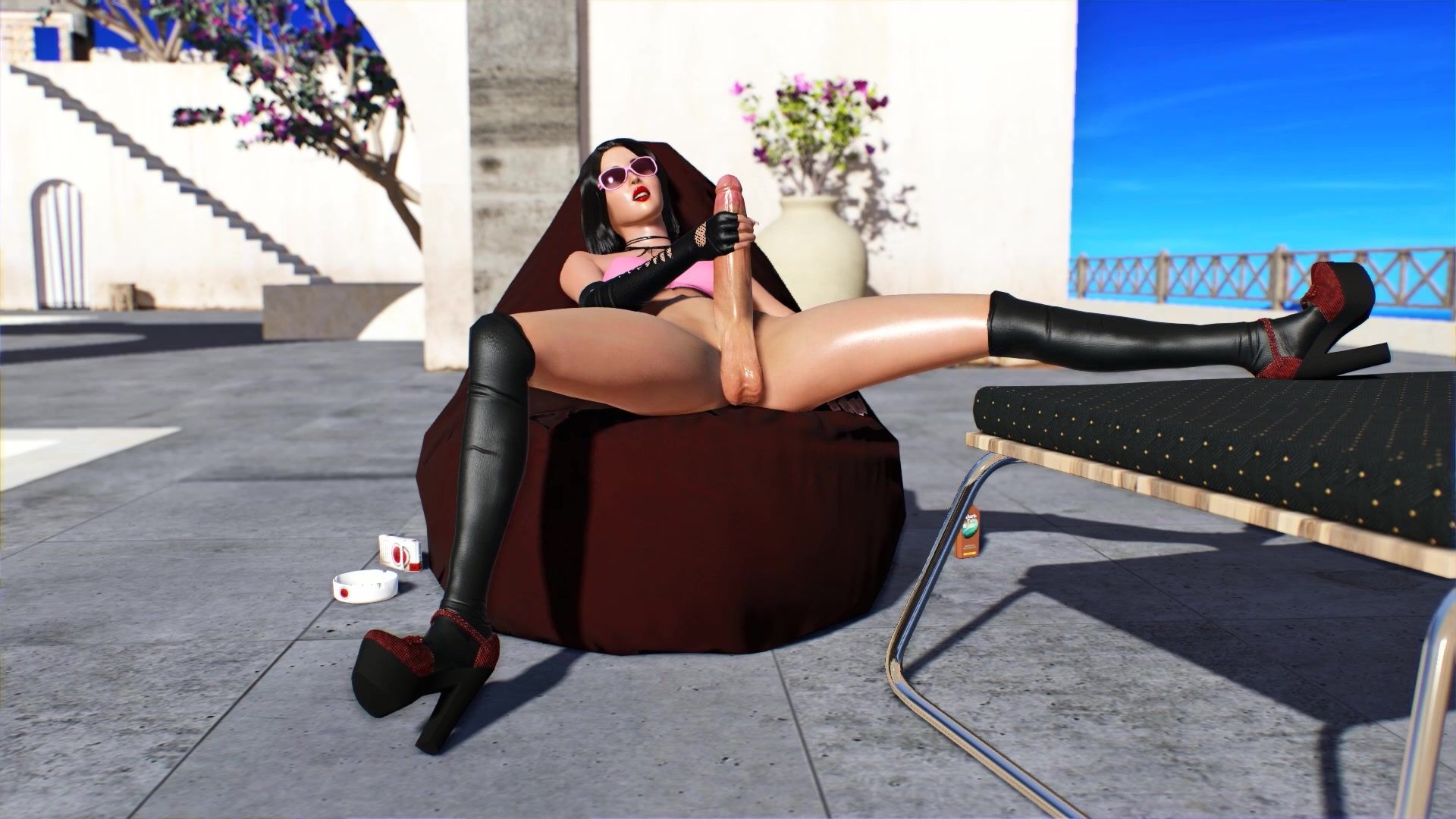 Horny futa girl and her girlfriend sunbathe and fuck outdoors