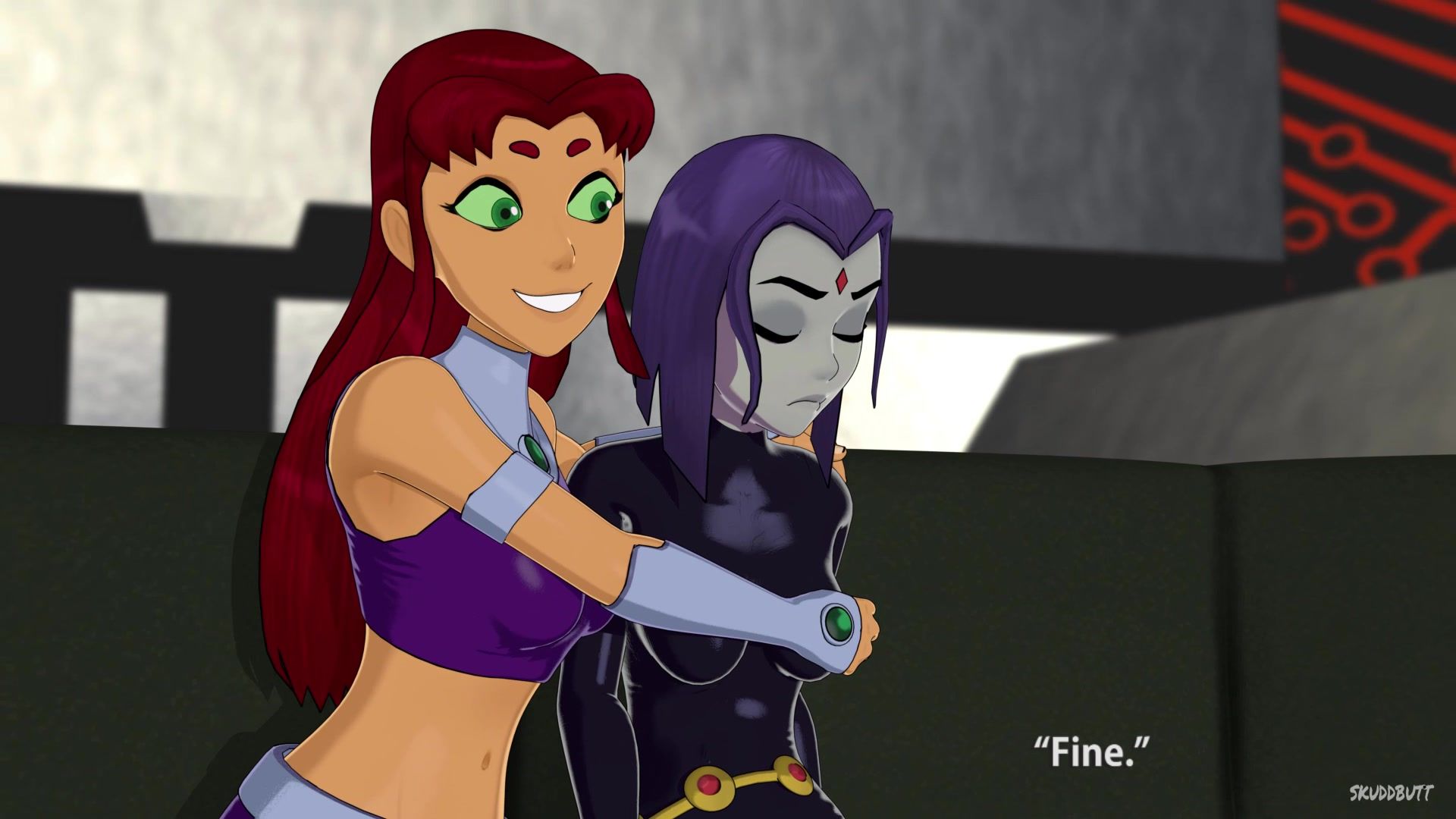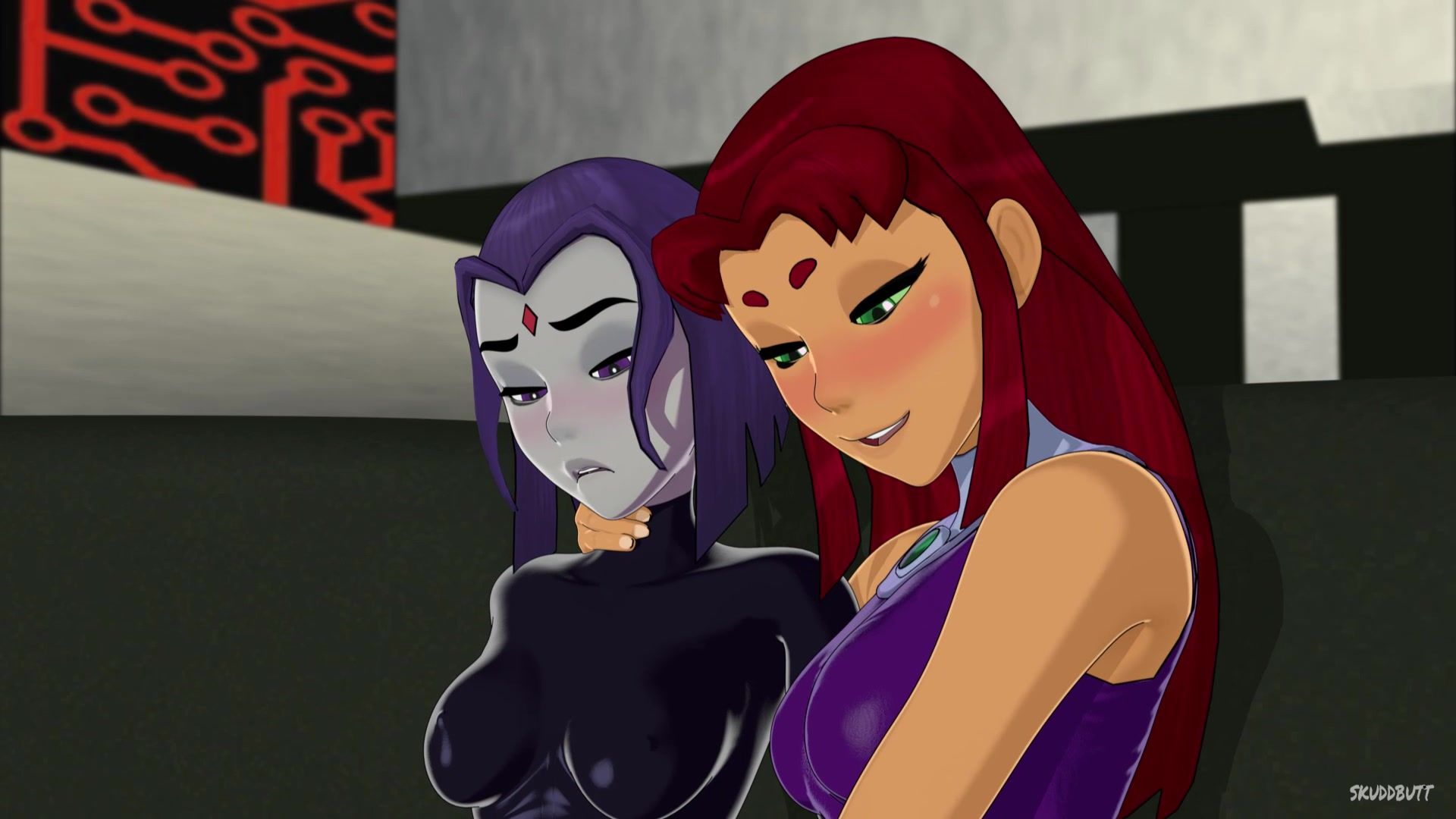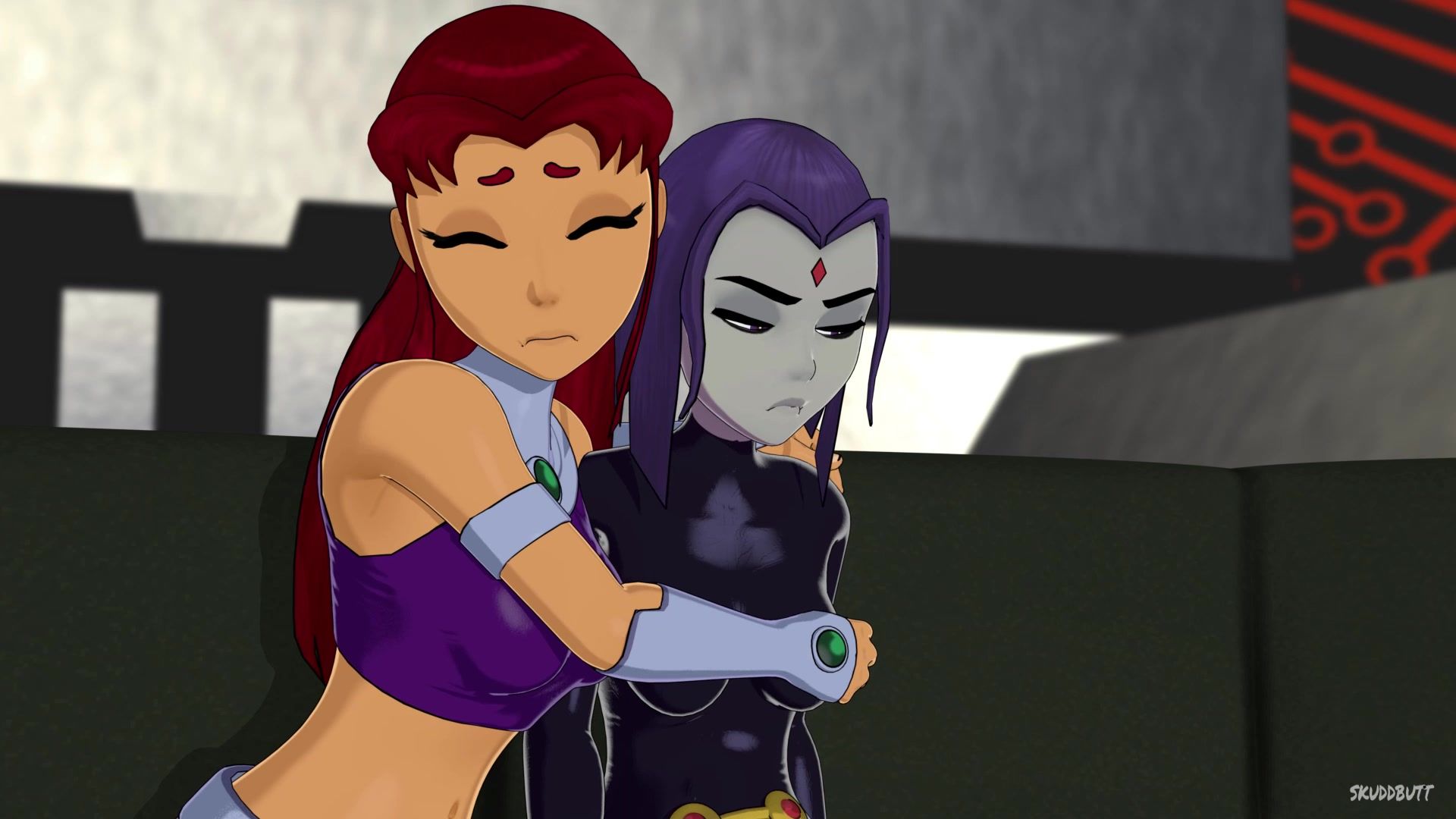 Lesbian Starfire rubbing girlfriend's Raven clit with fingers