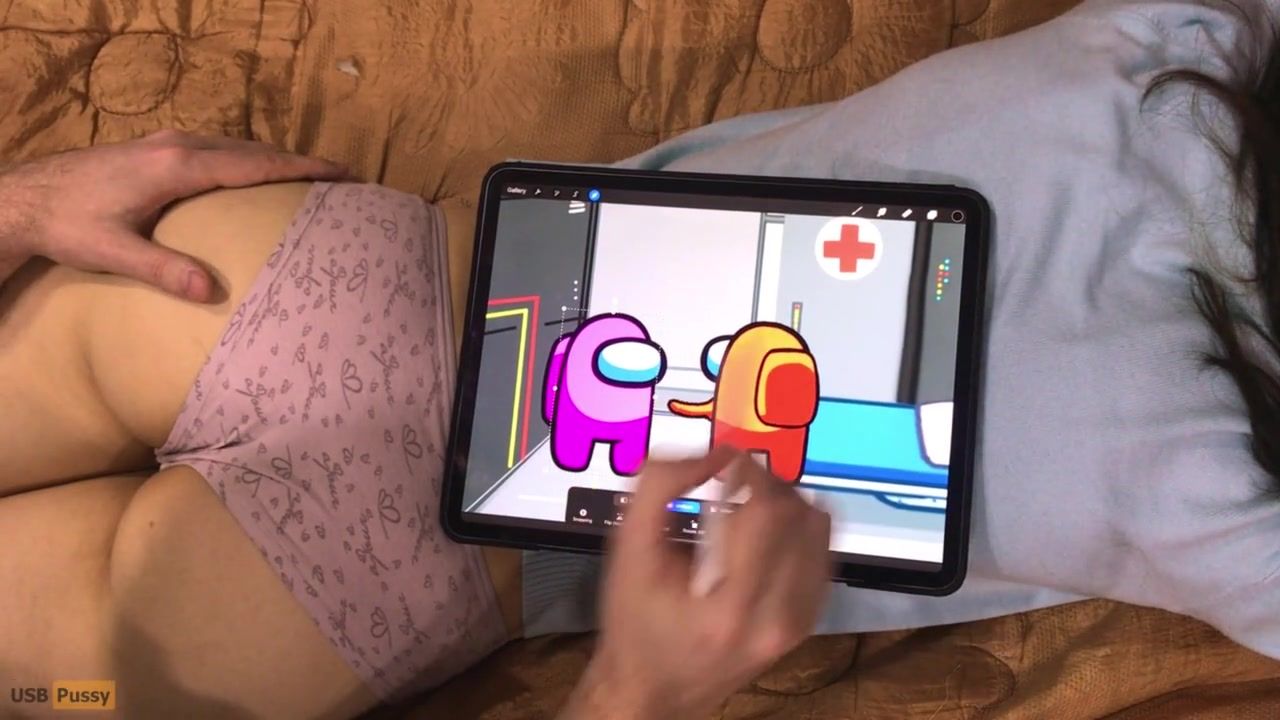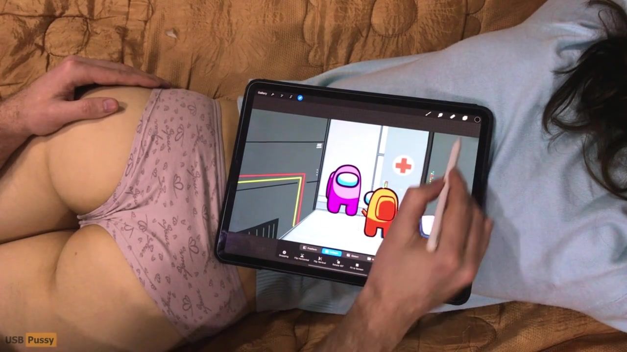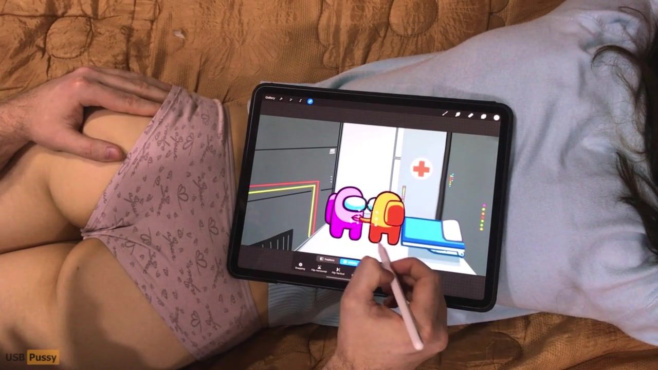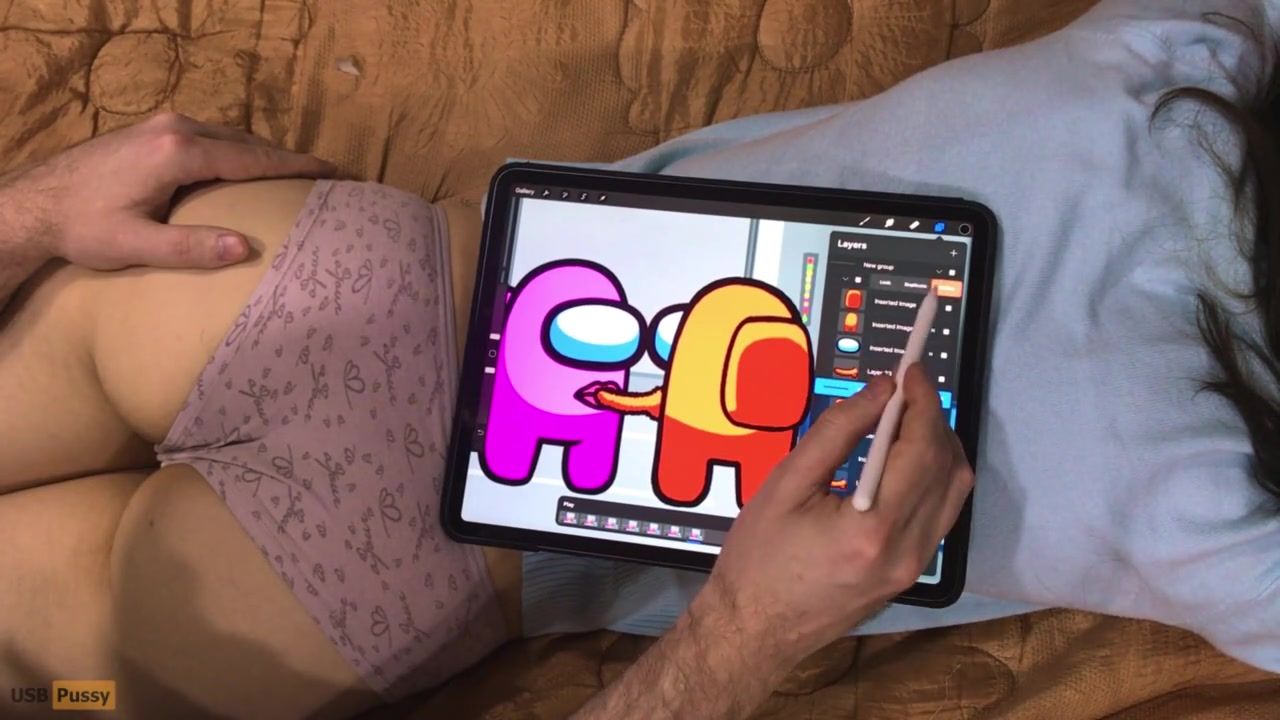 The artist draws anime with characters Among Us and gives a massage to her friend's buttocks