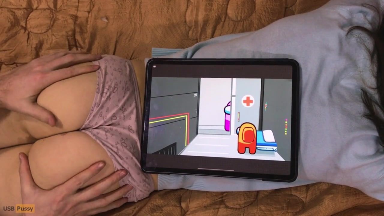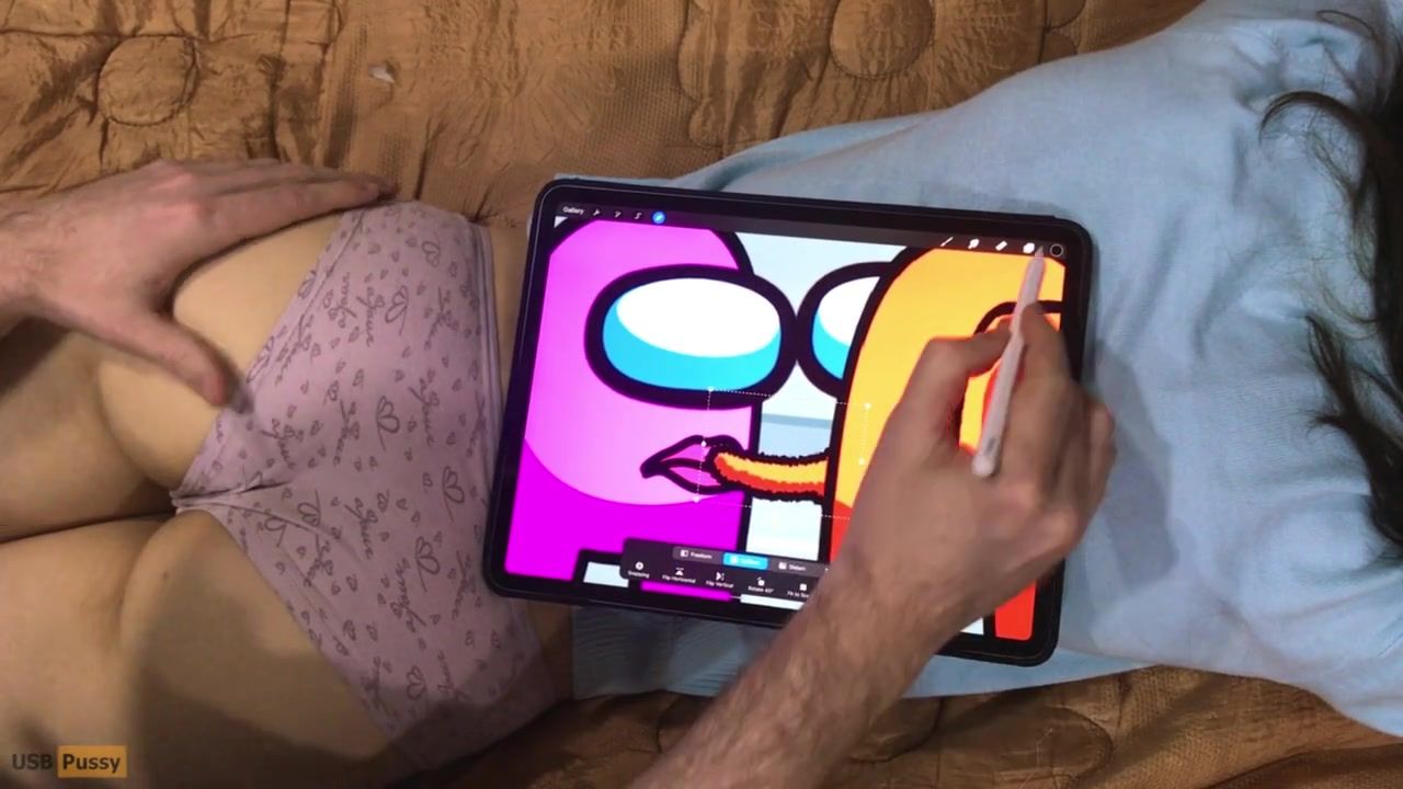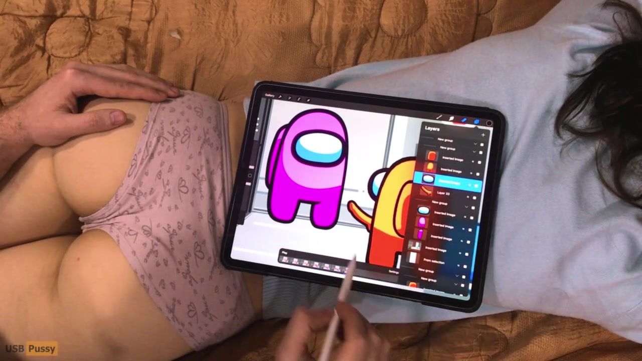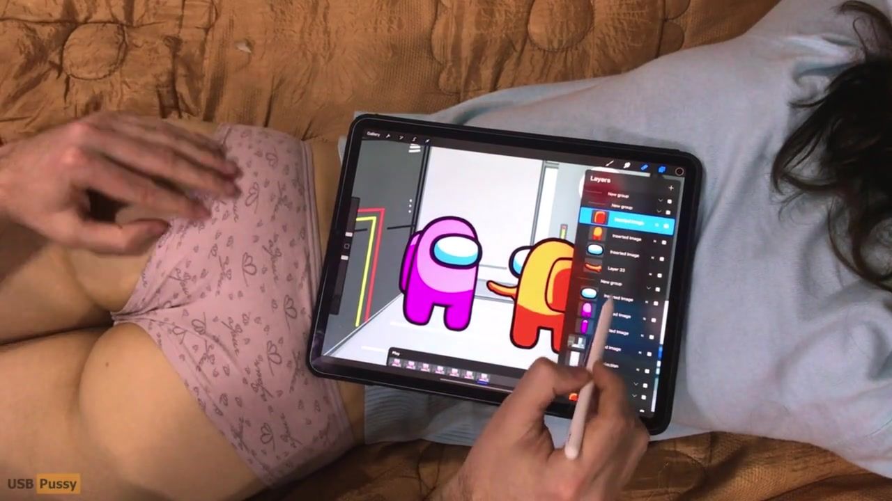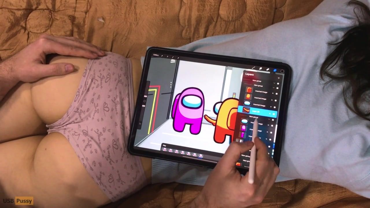 The artist draws anime with characters Among Us and gives a massage to her friend's buttocks
