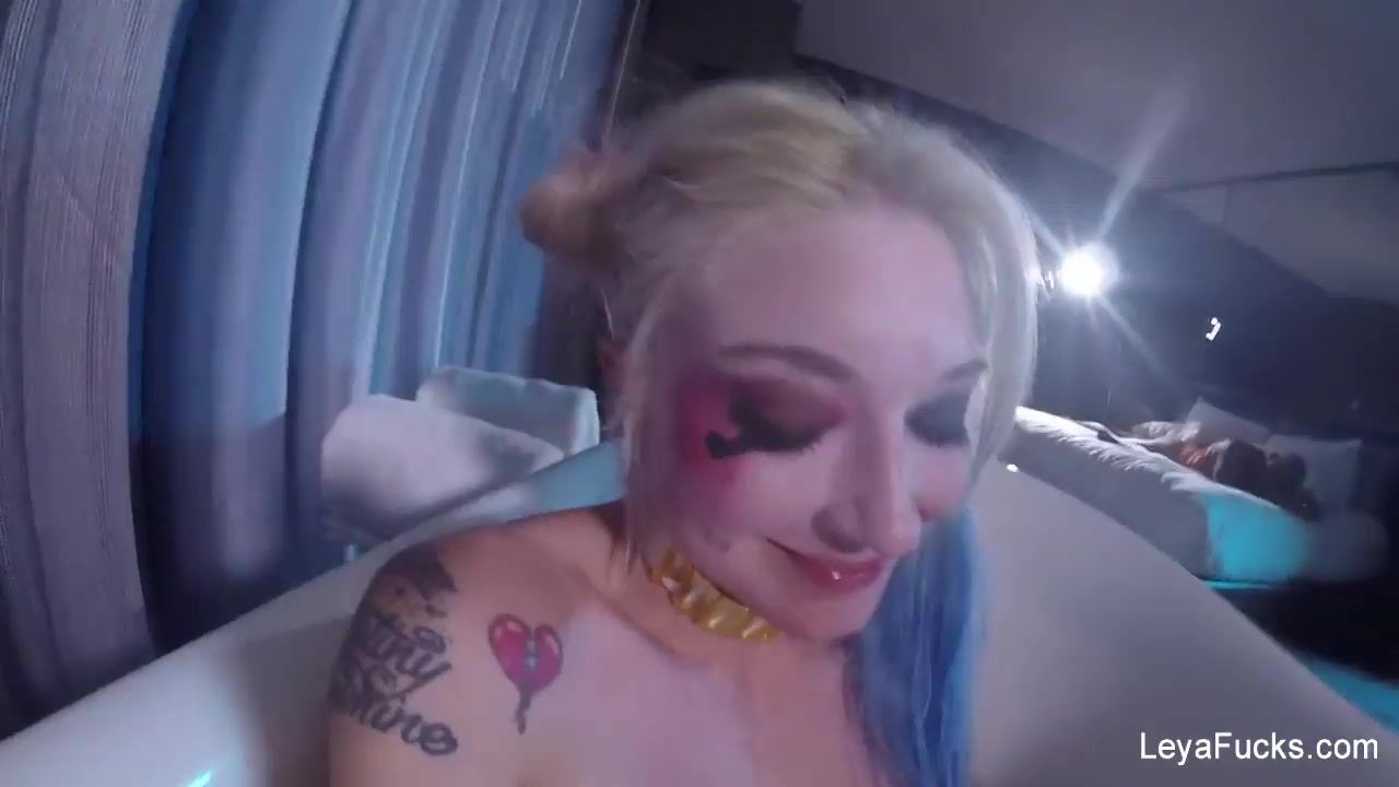 Busty cosplayer in the form of Harley Quinn has anal masturbation in the bath