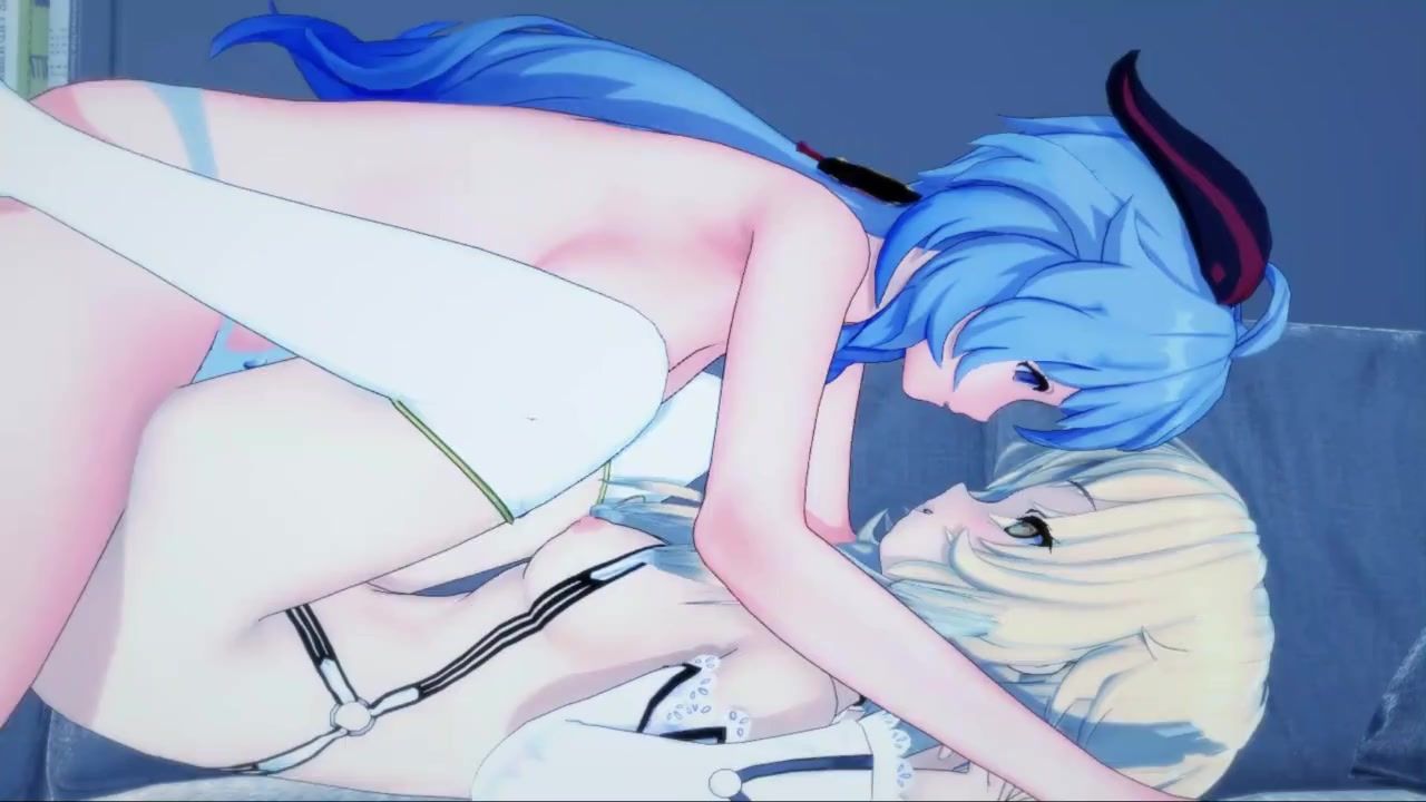 Lesbian Ganyu fucks girlfriend Lumin with a strap-on in hentai XXX cartoon