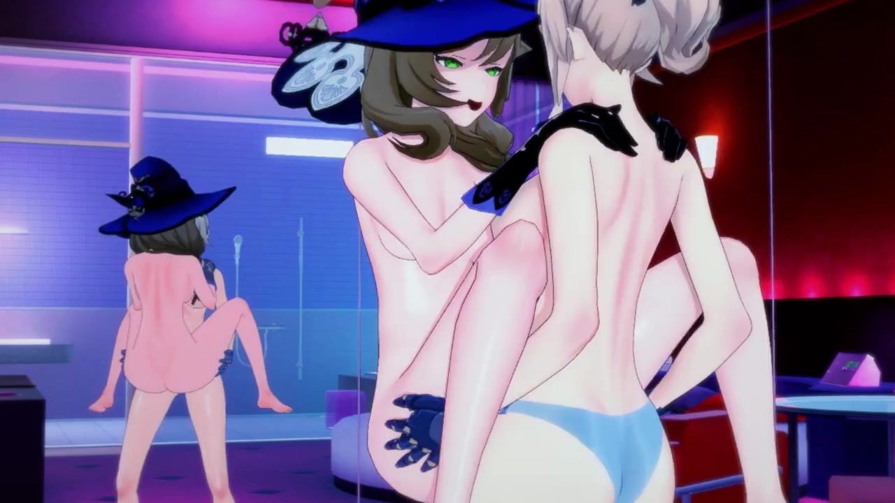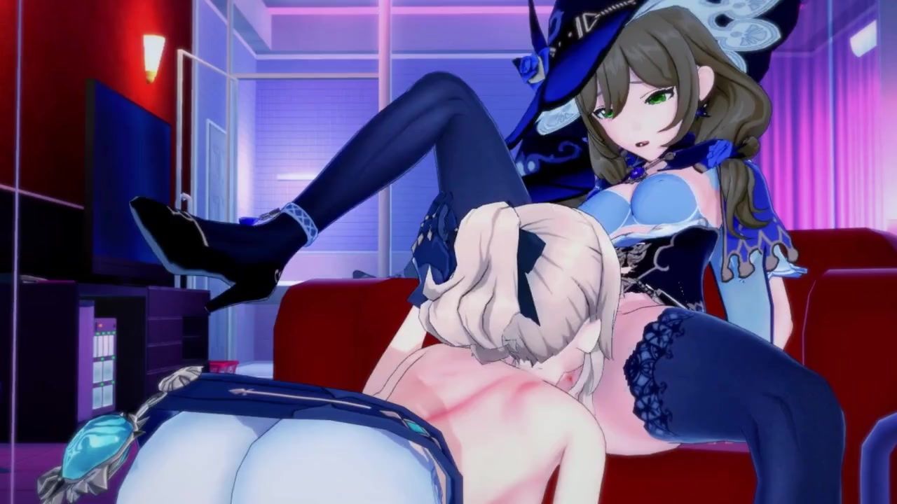 Blonde lesbian Lisa spread her friend Jean's legs and made her cunnilingus. After that, the girls from the popular game Genshin Impact engaged in passionate sex with a strap-on.