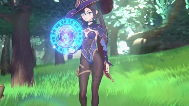 Cute sorceress Mona from the computer game Genshin Impact was walking through the forest and looking for herbs for a potion. She met a sexy stranger and the girl couldn't resist - she had sex with him.