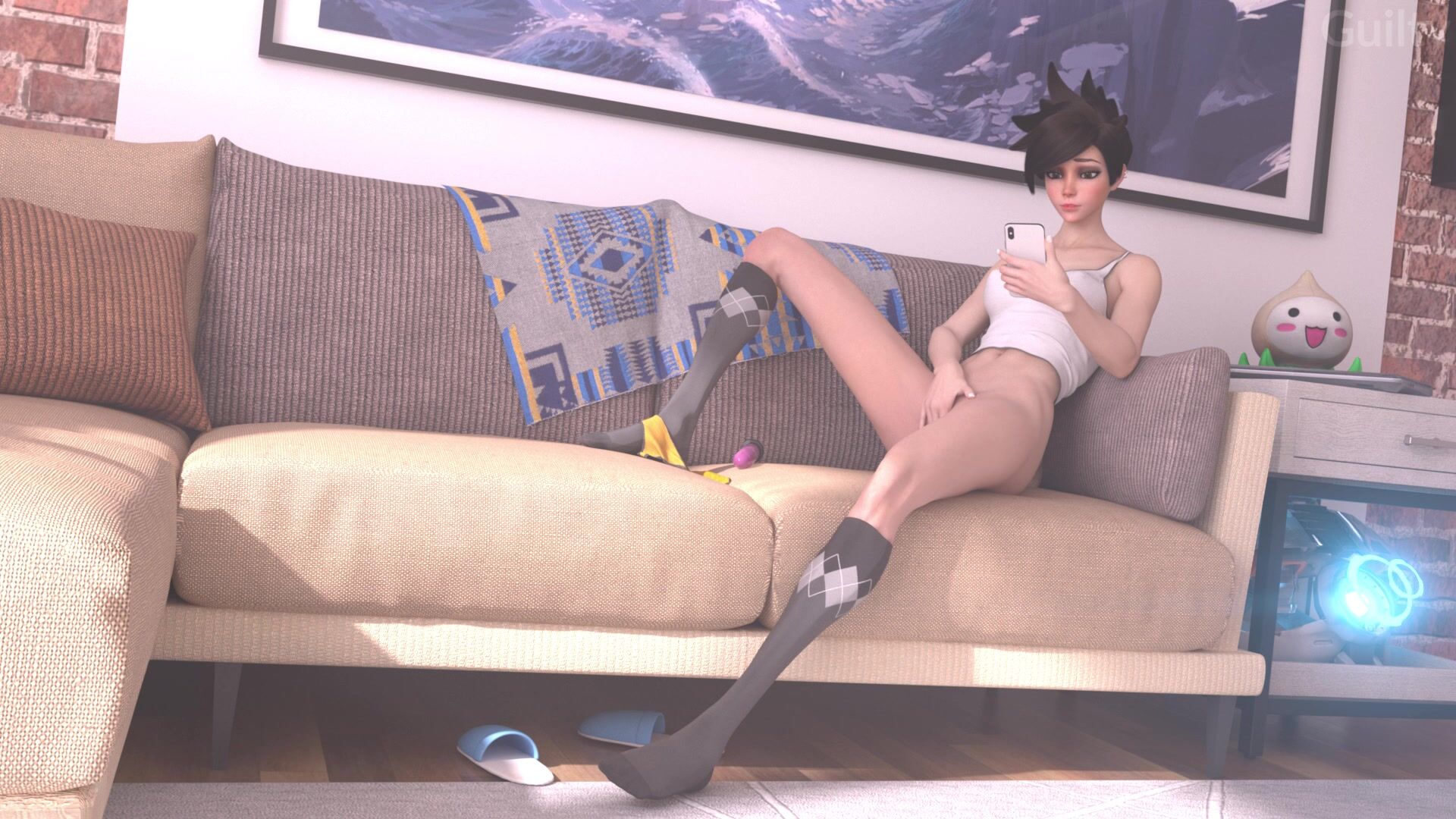 This is what Tracer girl from the Overwatch video game does in her spare time. In this hot 3D porn scene you'll see her masturbating her shaved pussy, doing it with her hands and even using her favorite dildo. A pretty girl in stockings looks at a naked girlfriend's photo on her smartphone and dreams of having sex with her.
