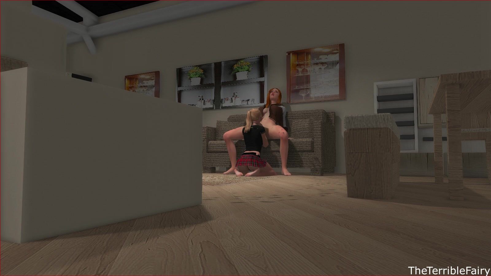 Animated slut in a skirt sucks a big cock of a red-haired futanari
