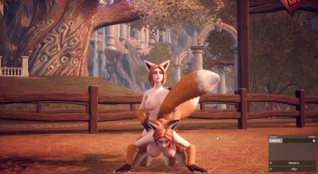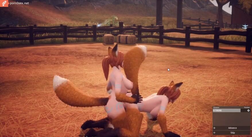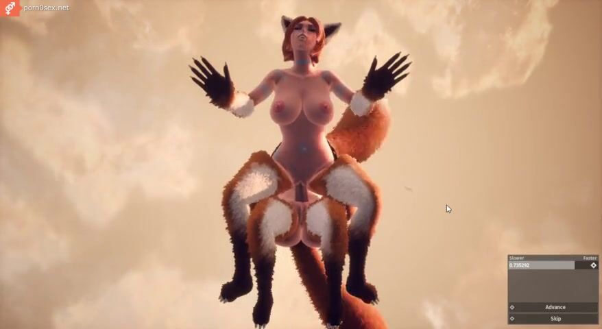 Red-haired Furry with a long tail has sex outdoors with a futanari fox
