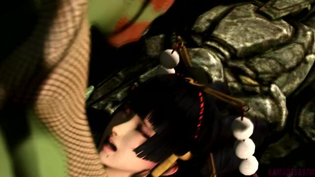 Girl warrior Nyotengu from the computer fighting game Dead or Alive woke up in the lair of an orc. It was a female orc, but with a huge futanari cock, so any man would envy her. Niotengu spread her legs and tested that hard tool.