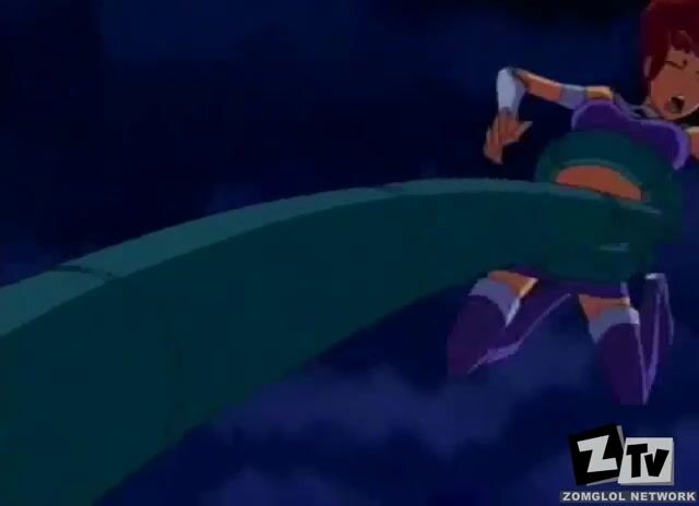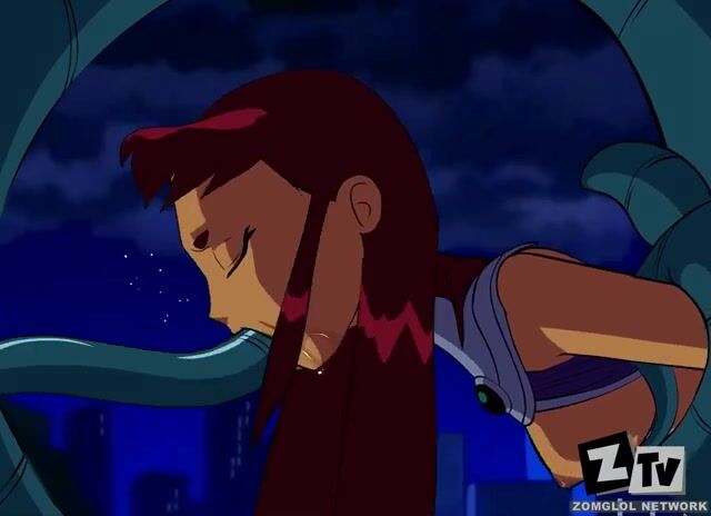 The town was attacked by a huge monster like Godzilla. He wanted to destroy all the houses, so Raven and Starfire from Teen Titans came out to fight him. The girls could have defeated the monster, but he released a lot of tentacles and they fucked them in all their holes.