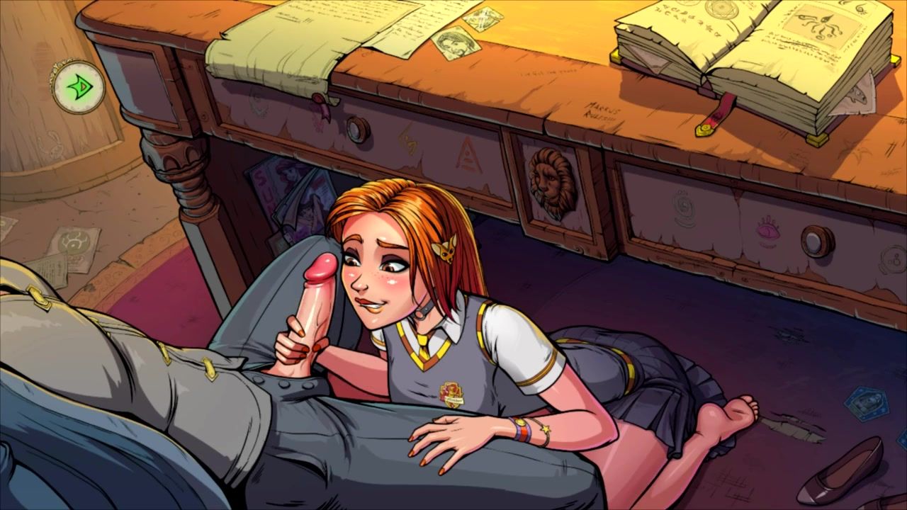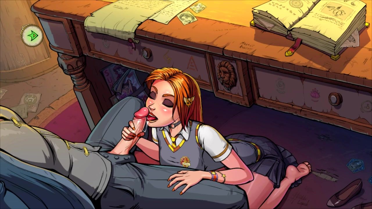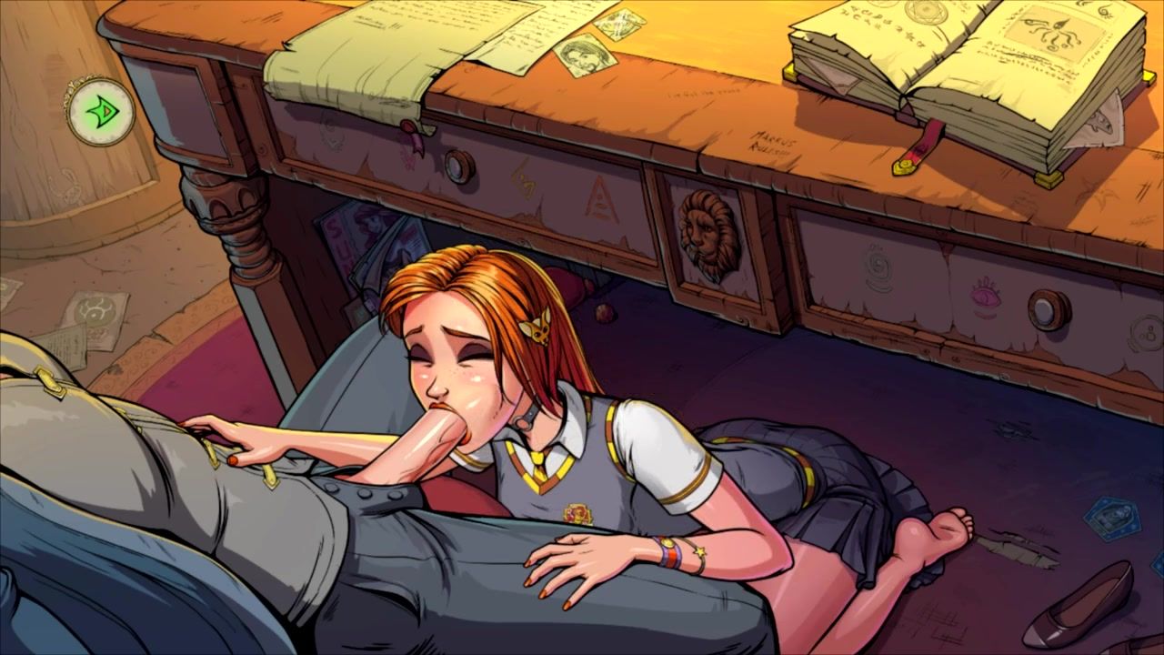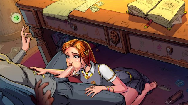 Ginny Weasley sucks Harry Potter's cock under the desk while kneeling until no one sees them between classes at Hogwarts. After a juicy and beautiful blowjob, he cums on her face with a powerful stream.