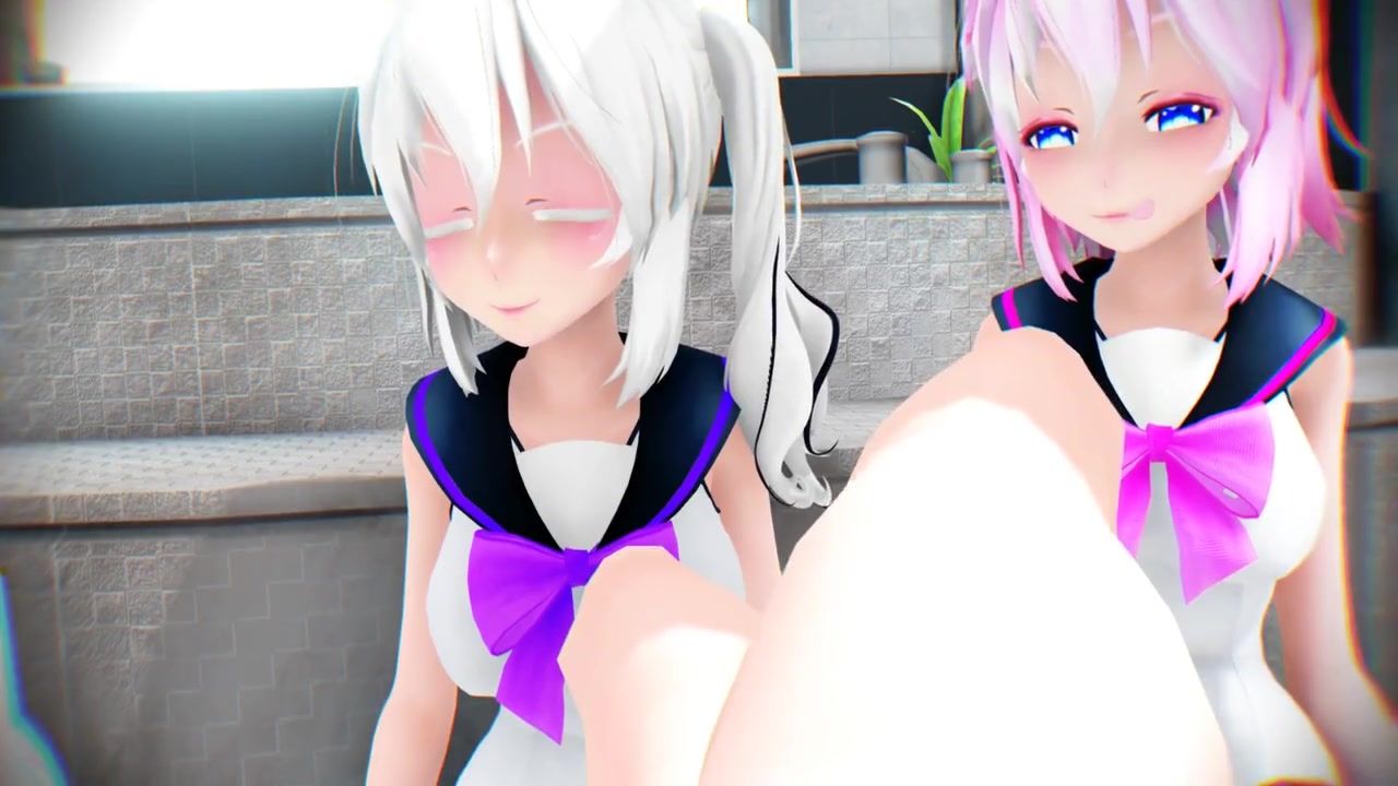 Shy brunette hentai princess worshiping white-haired trio's feet