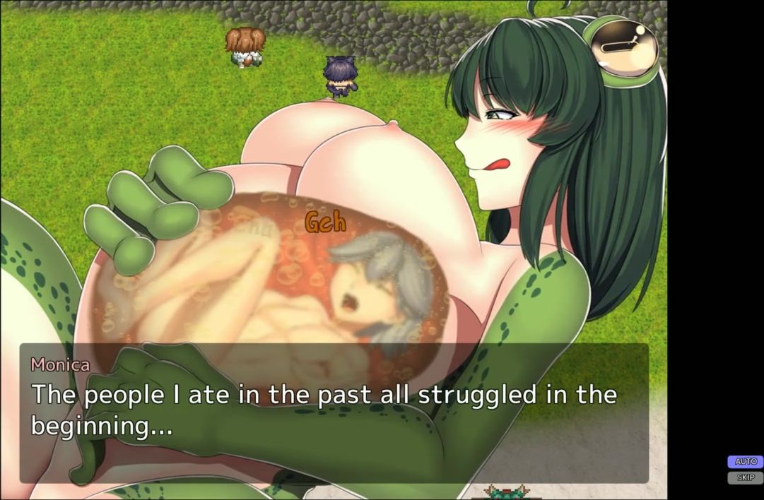 Tiny anime stud got stuck in horny frog girl's tummy