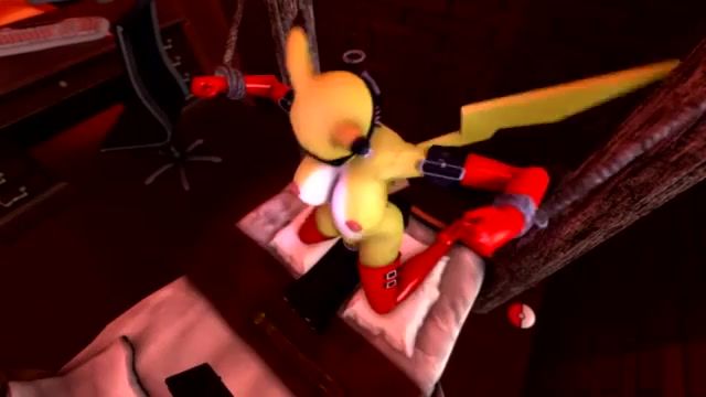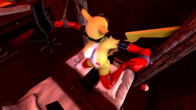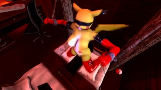 Libertine Ash Ketchum tied his Pokemon Pikachu with straps and sat her on a sex machine. The dildo moved and vibrated inside her pussy, so that Pikachu trembled all over and finished many times.