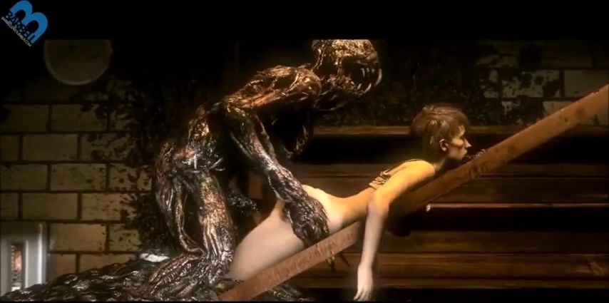 Weird zombie-like creature gapes a stunning brunette